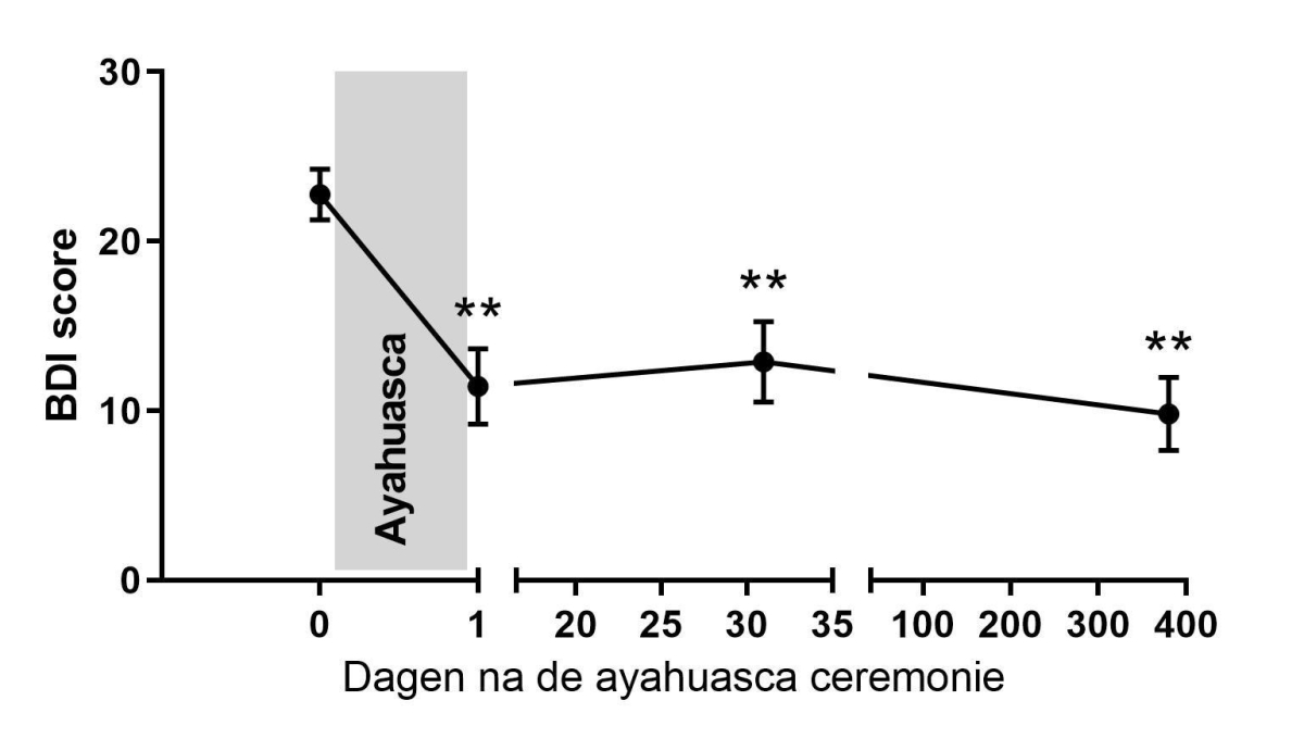 In een groep Nederlandse depressieve patiënten werd onlangs onderzocht of deze effecten ook langer kunnen aanhouden dan enkele weken (Van Oorsouw et al., 2022). Twintig patiënten die voldeden aan de diagnose ‘milde tot ernstige depressie’ deden mee aan het onderzoek. Zij hadden allemaal minstens 2 jaar last van hun depressie en waren onder behandeling (geweest) van een therapeut. Het merendeel had in het verleden antidepressiva gebruikt. Deelnemers bezochten uit eigen beweging een ayahuasca-sessie met als belangrijkste doel het genezen van hun depressie. Veranderingen in depressie, angst, stress, mindfulness, en kwaliteit van leven in deze mensen werden gemeten tot 1 jaar na de ayahuasca-sessie. Ook werd gekeken naar veranderde bewustzijnstoestanden (mystieke en onprettige ervaringen) tijdens de ayahuasca-sessie. Daarnaast werd bij alle deelnemers na de laatste meting een (semigestructureerd) interview afgenomen om na te gaan of ze in het jaar voor de laatste meting mogelijk nog iets anders hadden gedaan dat hun depressie zou kunnen hebben beïnvloed. In de grafiek hieronder is te zien dat er een afname was in depressie. Zestig procent van de deelnemers was 1 dag na de ceremonie niet meer depressief. Na 1 jaar was dit 71%. Behalve depressie namen ook angst en stressklachten af en nam mindfulness toe (Van Oorsouw et al., 2022). Behalve de ayahuasca-sessie waren er ook andere factoren die de herstelcijfers beïnvloedden. Bijna 90% van de deelnemers veranderden na de ayahuasca-sessie hun levensstijl: ze leefden gezonder, begonnen te mediteren of brachten meer tijd door in de natuur. Negen deelnemers gebruikten nog een tweede psychedelicum (ayahuasca of iets anders) in het tussenliggende jaar. Twee deelnemers pakten hun therapie weer op of konden die nu beter inzetten in hun herstel.