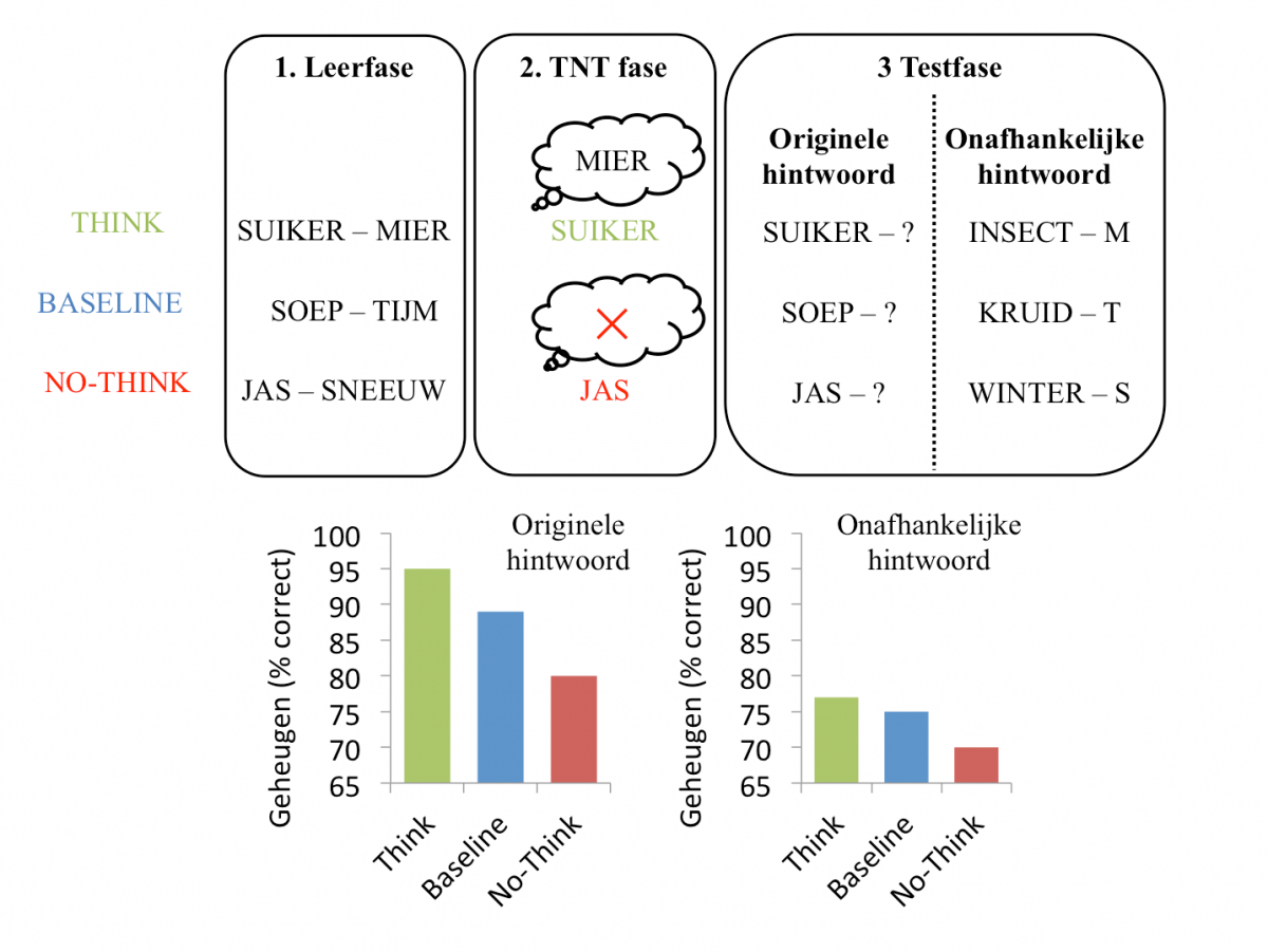 Het stoppen van het ophalen van herinneringen kan worden bestudeerd met de Think/NoThink (TNT) taak (Anderson & Green, 2001; Anderson et al., 2004). Deze taak bootst situaties na waarin het ophalen van een (ongewenste) herinnering moet worden gestopt en de herinnering dus uit het bewustzijn moet worden gehouden (zie Figuur 1). In de leerfase bestuderen deelnemers een lijst met ongeveer 45 woordparen die bestaan uit een hint en een respons (bijvoorbeeld SUIKER – MIER, SOEP – TIJM). Zij leren deze paren totdat zij in minstens 50% van de gevallen wanneer zij de hint zien (SUIKER), de respons (MIER) kunnen ophalen. In de TNT-fase wordt ieder woord 8 tot 16 keer gepresenteerd. Een deel van de hintwoorden zijn in het groen weergegeven; deelnemers moeten dan het responswoord ophalen (think). Een ander deel van de hintwoorden zien ze niet (baseline) en het overig deel van de hintwoorden is in het rood weergegeven (no think). Bij het zien van de rode hintwoorden krijgen deelnemers de instructie om niet aan het responswoord te denken en daarmee te zorgen dat het niet in hun bewustzijn komt. Hierbij speelt inhibitie een rol (Anderson, 2003). Het niet denken aan responswoorden horend bij de rode hintwoorden in de TNT-fase zorgt ervoor dat het ophalen van het responswoord op een latere (onverwachte) geheugentest minder makkelijk gaat. Deelnemers vergeten als het ware het responswoord voor deze rode hintwoorden en dat vergeten is zelfs groter dan voor responswoorden van paren die deelnemers überhaupt niet hadden gezien in de TNT-fase (Anderson & Huddleston, 2012; Stramaccia et al., 2020). Daarnaast is het zo dat hoe vaker deelnemers de instructie kregen om niet aan het responswoord te denken, hoe groter het vergeeteffect werd (Hanslmayr et al., 2009; Lambert et al., 2010; Lee et al., 2007). Dit toont aan dat er een actief proces speelt dat de toegankelijkheid van een herinnering aantast – en dat zorgt voor ‘vergeten.’