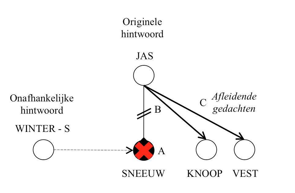 Figuur 2. Een onafhankelijk hintwoord (WINTER – S) kan worden gebruikt om te testen of het vergeten van het responswoord het gevolg is van inhibitie; het minder toegankelijk worden van het originele responswoord (A). Vergeeteffecten gevonden met de originele hintwoorden (JAS - ?) kunnen namelijk ook het gevolg zijn van interferentie door afleidende gedachten die de deelnemer tijdens de TNT fase zelf bedacht heeft om niet aan het responswoord te hoeven denken (C) of doordat de relatie tussen het hint en het responswoord afgeleerd is (B).