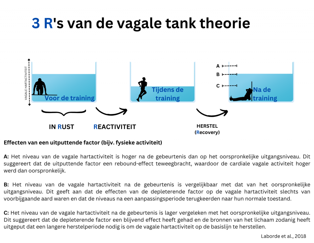 Volgens de Vagale Tank Theorie en de 3 R's' [7] bieden HRV-beoordelingen op korte termijn inzicht in de zelfregulatie van een atleet, dat wil zeggen het vermogen om welke fysieke of mentale uitdaging dan ook aan te gaan, waarbij rekening wordt gehouden met HRV op drie momenten (zie Figuur 3a en 3b):