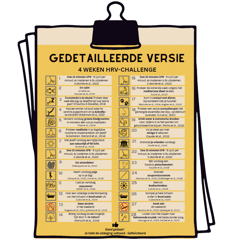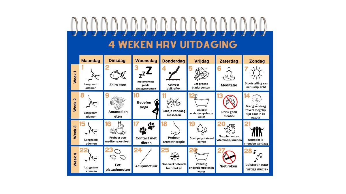 Er zijn veel manieren om je HRV te verbeteren. Een HRV-verbetering weerspiegelt een betere controle over je hart door het kalmerende deel van je zenuwstelsel. Deze methoden variëren van het veranderen van je ademhaling, zoals het beoefenen van een langzame ademhaling (SPB), tot het gebruik van een onderdompeling in koud water om de reactie van je lichaam op kou op te wekken. Bekijk de Figuren 4a & 4b voor een lijst met activiteiten die kunnen helpen om je HRV gedurende vier weken te verhogen.